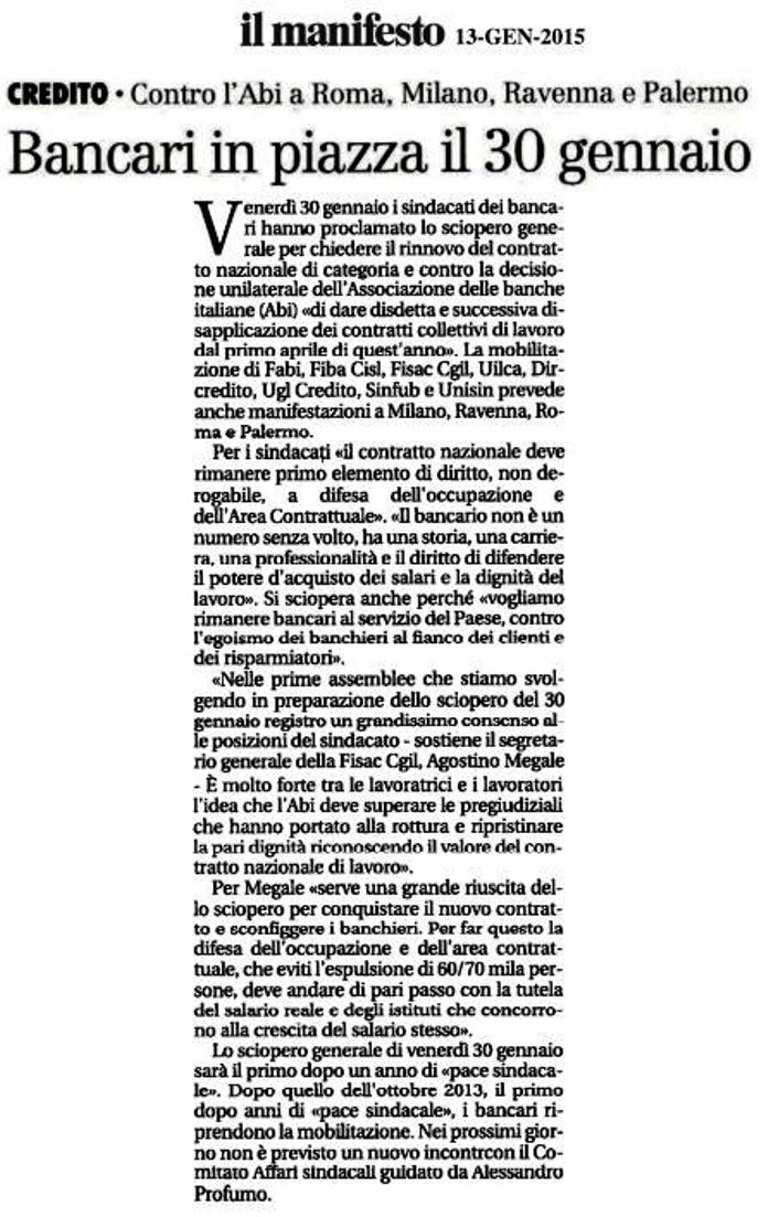 rinnovo del contratto dei bancari. Le organizzazioni sindacali Fabi, Fiba Cisl, Fisac Cgil, Uilca, Dircredito, Ugl Credito, Sinfub e Unisin hanno proclamato, per il 30 gennaio uno sciopero di tutta la categoria con manifestazioni a Milano, Ravenna, Roma e Palermo.