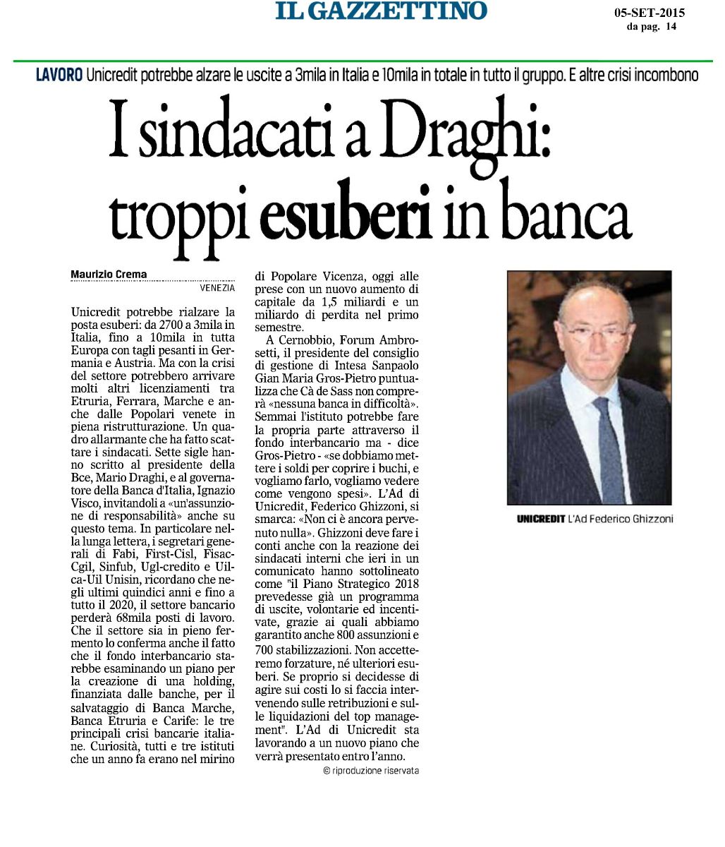 La FABI e le altre Organizzazioni scrivono a Draghi e a Visco chiedendo "un'assunzione di responsabilità sul tema occupazionale in vista delle fusioni". La notizia riportata da tutti i maggiori quotidiani: Corriere della Sera, Repubblica, Sole 24 Ore, MF, Gazzettino e Avvenire