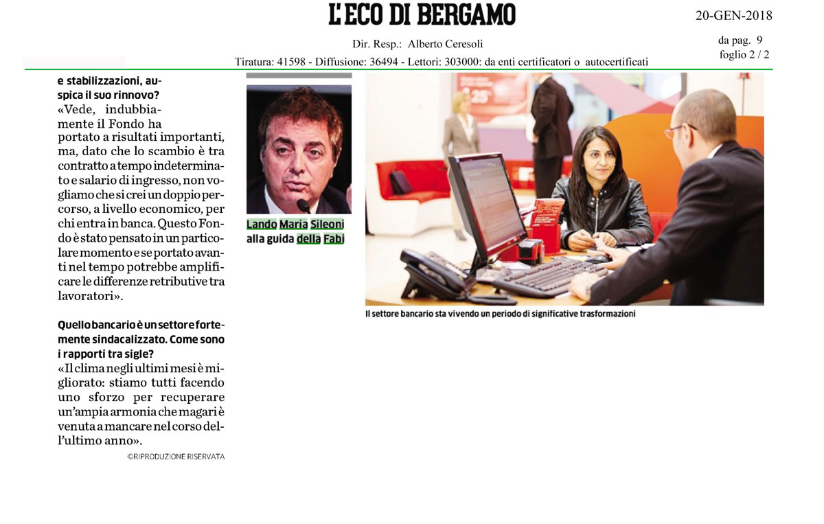 le=”text-align: justify”>Appello della FABI alla Commissione d’inchiesta, rinnovo del Contratto Nazionale, gestione Npl, scandali bancari, Fondo di Solidarietà e Fondo per l’occupazione giovanile, nuovo modello di banca. Il Segretario Generale Lando Maria Sileoni fa il punto in una lunga intervista a L’Eco di Bergamo.