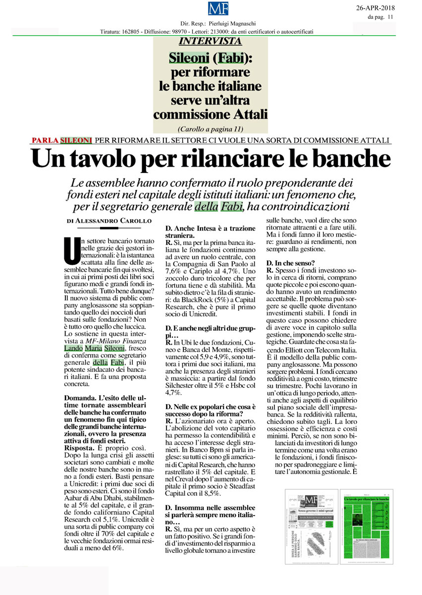 Il Segretario Generale della FABI, in una lunga intervista a Milano Finanza, fa il punto della situazione e propone una commissione per il rilancio del settore.