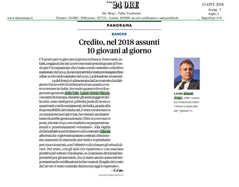 Ampio servizio andato in onda venerdì 12 ottobre 2018 su TGCOM 24 con i dati delle assunzioni in banca grazie al Fondo per la nuova occupazione, con le dichiarazione del Segretario Generale Lando Maria Sileoni. Il servizio è andato in onda su TGCOM 24 venerdì 12 ottobre 2018 nel TG Economy delle ore 14.45.