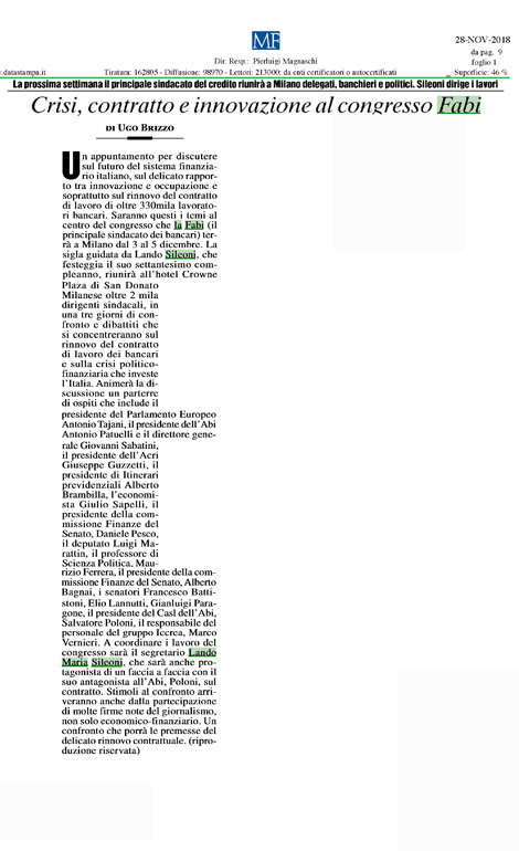 Banche: 70 anni Fabi, contratto e manovra al centro congresso Milano