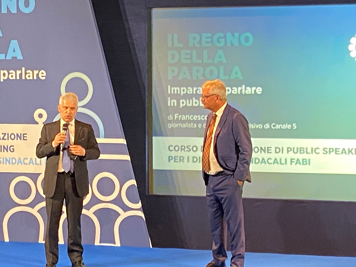 Ancora numerosi i sindacalisti presenti per assistere al corso di formazione organizzato dalla Fabi e tenuto dal conduttore di Canale 5, Francesco Vecchi, sull’arte del saper parlare in pubblico. Il segretario generale della Fabi, Lando Maria Sileoni, ha aperto la sessione.