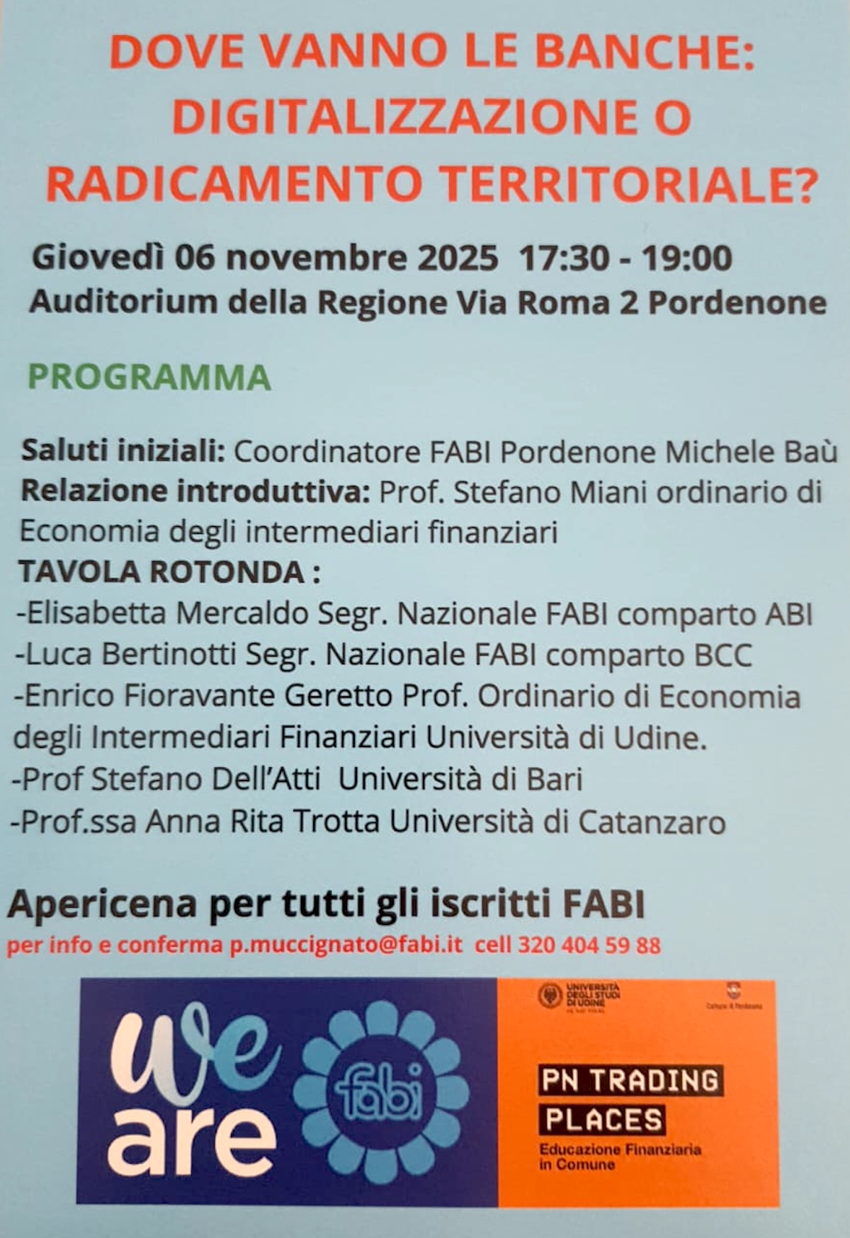 La Fabi Pordenone ha organizzato un incontro sul futuro del settore del credito tra tecnologia e centralità delle persone. Presenti i segretari nazionali Elisabetta Mercaldo e Luca Bertinotti insieme a docenti dell’Università di Udine.