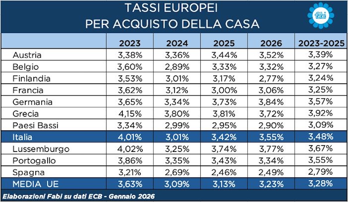 Nel 2023 il tasso medio sui prestiti di chi comprava casa in Italia era pari al 4,01%, con un differenziale importante di ben 80 punti base rispetto alla Spagna (3,21%) e di 39 punti base se confrontato con la Francia (3,62%). Un dato che attestava quasi un punto percentuale di differenza con i cittadini spagnoli e che si traduceva in effetti nettamente tangibili sul portafoglio delle famiglie italiane. Anche guardando al resto del campione, il 2023 collocava l’Italia in un’area di costo elevata per i mutui immobiliari: +67 punti base sui Paesi Bassi (3,34%), +63 sull’Austria (3,38%) e +48 sulla Finlandia (+3,53%). Lo scarto si attestava a 41 punti base nel confronto con il Belgio (3,60%), a 36 punti base con la Germania (3,65%) e 15 punti base rispetto al Portogallo (3,86%). Nella mappa europea dei tassi, solo a fine 2024 l’Italia si muoveva su livelli prossimi a quelli meno onerosi, e con soli pochi Paesi che facevano peggio. Tra le nazioni dove i prestiti immobiliari registravano un costo più elevato, figuravano la Grecia, con un tasso prossimo al 4,0% (3,80%) e il Lussemburgo a 3,25%. A seguire, Francia, Portogallo e Germania che registravano valori superiori al 3%. A dicembre 2024, in Italia il tasso medio applicato ai prestiti per la casa era del 3,01%, mentre condizioni più favorevoli si registravano in Spagna, dove il tasso si fermava al 2,69% e nei Paesi Bassi, dove raggiungeva una soglia già inferiore al 3% (2,99%), con un differenziale rispettivamente pari a 32 punti base con gli spagnoli e 2 punti base con i Paesi Bassi. Meglio dell’Italia anche il Belgio, con un 2,89% e un distacco di circa 12 punti base. La discesa dei tassi, avviata nel 2024, trova una battuta di arresto per i mutui immobiliari negli ultimi mesi del 2025. Con il 3,42% a fine 2025, il costo del denaro per le famiglie italiane che decidevano di investire nel mattone restava sempre più alto del prezzo pagato da molti altri cittadini europei. La fotografia dei tassi oltre i confini nazionali mostra che chi comprava casa in Spagna, pagava mediamente il 2,46%, contro un 3% netto della Francia e un 2,95% dei Paesi Bassi. Un differenziale che passava da 42 punti base in meno per i mutui sottoscritti in Francia a 47 punti base in meno per i Paesi Bassi e ben 96 punti base per la Spagna, attestando distanze che si trasformano in rate più pesanti e in maggiore costo complessivo del finanziamento. A inizio 2026, con un tasso medio sui mutui in Italia pari al 3,55%, il costo del finanziamento per le famiglie torna a salire e resta lontano dai Paesi più convenienti del campione. Il confronto è immediato con la Spagna, che si ferma al 2,49%, e con i Paesi Bassi, al 2,90%, mentre la Francia si attesta al 3,06%. Ne deriva un divario che arriva a 106 punti base rispetto agli spagnoli, a 65 punti base rispetto agli olandesi e a 49 punti base rispetto ai francesi, confermando che il mutuo “tricolore” continua a costare di più. Anche nel confronto con il valore medio europeo, pari al 3,23%, l’Italia resta sopra di 32 punti base, segnalando un posizionamento che rimane nella fascia alta dei tassi. La fotografia 2026 mostra, inoltre, che l’Italia non è schiacciata verso il basso nemmeno nella restante mappa dei Paesi. Con il 3,55%, il tasso italiano risulta superiore al Portogallo (3,34%) di 21 punti base e al Belgio (3,32%) di 23 punti base, mentre resta appena sopra l’Austria (3,52%) di 3 punti base. I pochi livelli più elevati, nel 2026, si concentrano in Germania (3,84%), Lussemburgo (3,77%) e Grecia (3,72%), Paesi che continuano a presidiare la parte più alta della classifica insieme all’Italia.