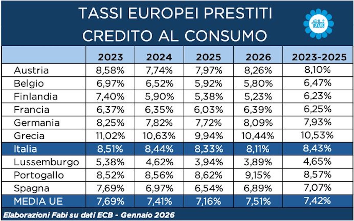 È sul credito al consumo che si misura il vero squilibrio del sistema italiano. Nel 2025 i prestiti personali raggiungono un tasso medio dell’8,33%, oltre 110 punti base sopra la media europea del 7,16%, con un divario che non si riduce ma si amplia nel triennio. Nel 2026 il tasso medio sui prestiti personali in Italia scende all’8,11%, mentre la media europea si attesta al 7,51%, riducendo il divario a circa 60 punti base rispetto ai 117 del 2025, ma confermando comunque livelli più elevati rispetto alla media dell’area euro. Un’anomalia strutturale che pesa sui bilanci familiari e segnala un meccanismo di formazione dei prezzi finali dei prestiti che resta ancora inceppato. Se la discesa del costo del denaro si intravede, ma poi si arresta, dove c’è la garanzia – ovvero sui mutui immobiliari – molto meno accade quando c’è bisogno di liquidità per l’acquisto di un bene o per sostenere le spese correnti. Quando si guarda al mercato dei prestiti al consumo, il confronto con i principali mercati europei mostra distanze nette dell’Italia dal resto dell’Europa. Che si tratti del 2023, 2024 e del recente fine 2025 e inizio 2026, il tasso medio applicato è sempre più alto rispetto alla media, segnalando fin dall’inizio un disallineamento strutturale. A dicembre del 2023, a fronte di un costo del credito al consumo in Europa del 7,69%, l’Italia risultava comunque più cara di 82 punti base, con un divario che si amplia a fine 2025, quando la media del prezzo del prestito per le famiglie italiane si attesta all’8,33%, rispetto ad un valore medio europeo del 7,16%. Il dato più alto, ma non lontano da quello più recente, è stato registrato proprio a fine 2023, quando il costo del credito al consumo per le famiglie italiane si avvicinava al 9% (8,51%). Infatti, mentre in Francia il tasso si attestava al 6,37%, con un differenziale di ben 214 punti base rispetto all’Italia, in Spagna il costo medio era del 7,69%, ovvero pari a 82 punti base in meno. Anche il Belgio, fermo al 6,97%, evidenziava un importante scarto di 154 punti base, seguito dalla Finlandia con una percentuale del 7,40% e un gap di 111 punti base. Guardando al resto del campione, il 2023 confermava il primato italiano in negativo rispetto ai principali Paesi europei: il tasso per un prestito tricolore superava anche quello della Germania (8,25%). Pochi i Paesi che in quell’anno registravano un dato peggiore dell’Italia: il Portogallo era appena sopra, all’8,52%, con un differenziale di un solo punto base, mentre la sola Grecia si collocava nettamente più in alto, all’11,02%. Infine, all’estremo opposto si trovava il Lussemburgo al 5,38%, mostrando quanto il costo del credito personale potesse essere più contenuto altrove, con una distanza di 313 punti base rispetto al dato italiano. La distanza emerge con chiarezza anche guardando ai dati del 2024, quando il tasso medio in Italia era pari all’8,44%, mentre la media di tutti i Paesi scendeva al 7,41% rispetto all’anno precedente, segnando uno scarto medio di 103 punti base. Anche in questo caso il confronto con Francia e Spagna restava sfavorevole: i francesi si fermavano al 6,35% e gli spagnoli al 6,97%, con differenziali rispettivamente di 209 e 147 punti base. Meglio anche il Belgio, al 6,52%, che manteneva un vantaggio di ben 192 punti base rispetto all’Italia. A fine 2025, a fronte di una media tra Paesi europei del 7,16%, le condizioni di finanziamento per i cittadini italiani erano nettamente sfavorevoli per chi ricorreva al credito al consumo. Il tasso medio in Italia raggiungeva quota 8,33%, con una distanza di 117 punti base rispetto al resto d’Europa e che si traduce – ancora una volta – in rate più pesanti e in un costo complessivo più alto per chi decide di finanziarsi. Sempre nel 2025, in Francia il tasso si fermava al 6,03% e in Spagna al 6,54%, con un differenziale che si attestava rispettivamente a 230 e 179 punti base. Anche il Belgio offriva condizioni più leggere, con un tasso del 5,92% e uno scarto di 241 punti base rispetto all’Italia. Nello stesso periodo i valori dei tassi per Germania e Austria risultavano inferiori a quelli italiani e si collocano rispettivamente al 7,72% e al 7,97%. Sul versante opposto, i Paesi dove il costo del prestito personale era più contenuto erano la Finlandia, scesa al 5,38% e il Lussemburgo al 3,94%, tracciando un solco che diventa di diversi punti percentuali. All’estremo restava la Grecia, ancora su livelli molto elevati al 9,94%, mentre il Portogallo si confermava su valori di poco superiori a quelli italiani, ovvero all’8,62%. Nel 2026 il tasso medio sui prestiti personali in Italia resta al di sopra della media europea, con un valore tricolore dell’8,11%, rispetto al 7,51% e con un divario che si pone ancora sopra quota 50 punti base. In Francia il tasso resta ad una soglia più contenuta e pari al 6,39%, così come in Spagna (6,89%) e in Belgio (5,80%). Completano la rosa dei Paesi con condizioni di prestiti al consumo più vantaggiose rispetto a quelle italiane la Germania, con un tasso medio dell’8,09%, Finlandia (5,23%), Belgio (5,80%) e il Lussemburgo al 3,89%. Gli unici Paesi con i tassi più elevati rispetto all’Italia restano Grecia e Portogallo, rispettivamente al 10,44% e al 9,15%, seguiti dall’Austria con l’8,26%.