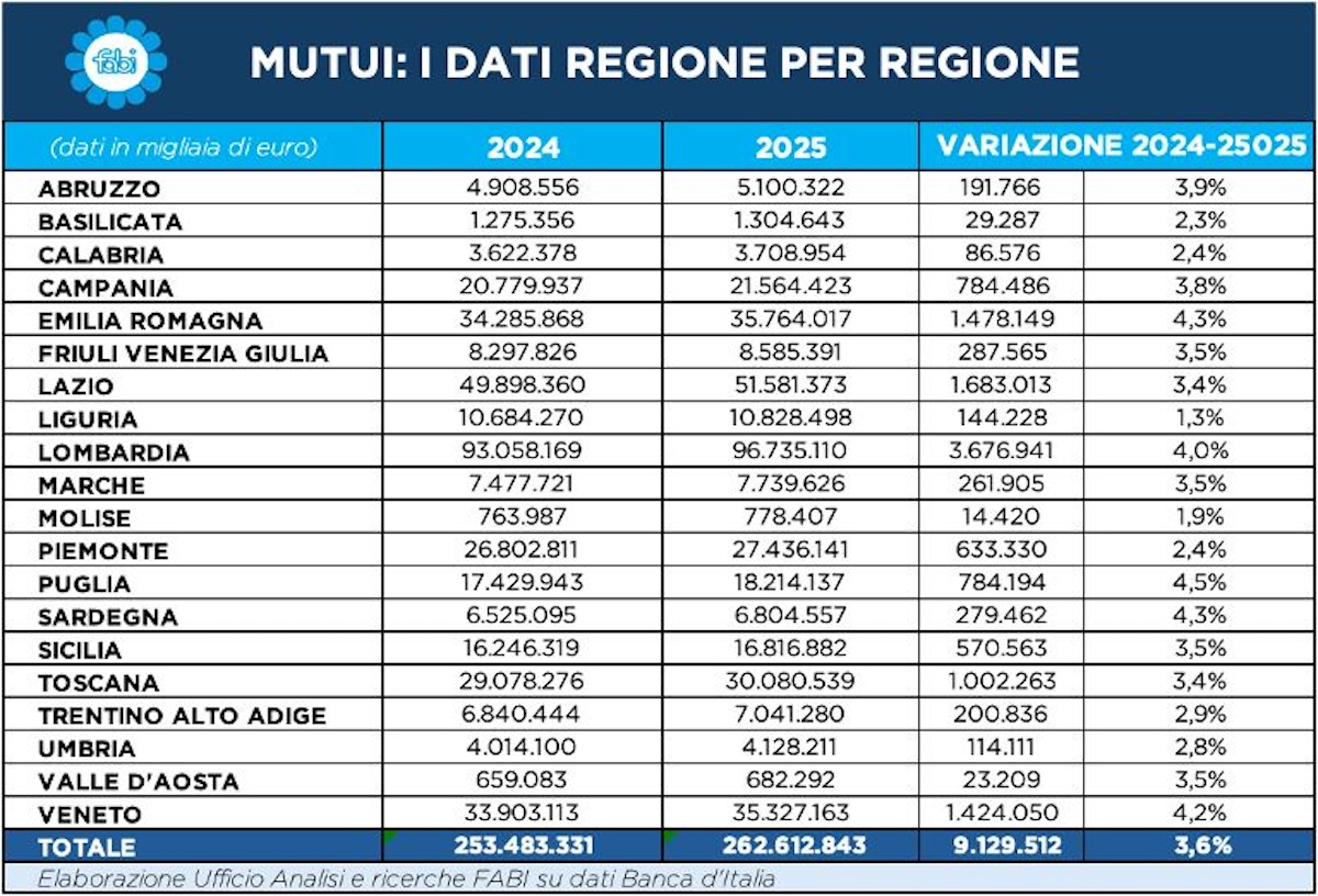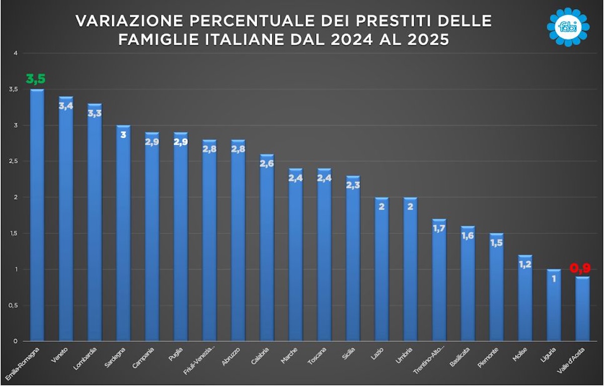 Nel 2025 i prestiti complessivi alle famiglie tornano a crescere, superando i 604 miliardi di euro, ma dietro il dato positivo si nasconde una dinamica a due velocità. Da un lato, i mutui segnalano una capacità di pianificazione ancora presente in alcune aree del Paese; dall’altro, l’aumento del credito al consumo racconta una pressione crescente sui bilanci familiari e un ricorso al debito per sostenere le spese quotidiane. Letti insieme, i due indicatori raccontano una dinamica non contraddittoria ma complementare: una parte delle famiglie riesce ancora a programmare e investire, mentre un’area sempre più ampia utilizza il credito come strumento di tenuta quotidiana. È in questo scarto che si misura la frattura sociale del credito, e non nella crescita dei volumi complessivi. Nel confronto tra 2024 e 2025, l’ammontare complessivo dei prestiti alle famiglie in Italia, comprensivi di tutte le tipologie di finanziamento e in particolare dei mutui per l’acquisto dell’abitazione, aumenta da 580,9 a 604,2 miliardi di euro, con un incremento pari a 23,3 miliardi, corrispondente a una crescita del +4,0%. A differenza del credito al consumo, l’andamento dei prestiti riflette una dinamica di più lungo periodo, legata alla capacità di pianificazione finanziaria, all’accesso al credito bancario e alla volontà di investimento delle famiglie. Il dato nazionale rappresenta il riferimento per l’analisi delle dinamiche regionali. La Lombardia si conferma la prima regione per stock di prestiti alle famiglie, con un aumento da 132,0 a 136,3 miliardi di euro, pari a +4,32 miliardi e a una crescita del +3,3%, leggermente inferiore alla media nazionale ma significativa in valore assoluto. Il contributo lombardo rappresenta una quota rilevante dell’aumento complessivo italiano, segnalando una domanda ancora sostenuta di finanziamenti a medio-lungo termine. Segue il Lazio, che passa da 72,1 a 73,6 miliardi, con +1,47 miliardi (+2,0%), una crescita più contenuta che riflette una fase di maggiore stabilità dopo gli incrementi degli anni precedenti. Il Veneto registra un aumento da 51,7 a 53,5 miliardi, con +1,75 miliardi e una variazione del +3,4%, mentre l’Emilia-Romagna cresce da 50,3 a 52,1 miliardi, con +1,76 miliardi (+3,5%). In entrambe le regioni la dinamica dei prestiti conferma una buona capacità di accesso al credito e una domanda legata prevalentemente al comparto immobiliare. La Toscana passa da 43,6 a 44,6 miliardi di euro, con un incremento di 1,06 miliardi (+2,4%), mentre il Piemonte cresce da 43,8 a 44,5 miliardi, con +0,68 miliardi e una variazione del +1,5%, tra le più contenute a livello nazionale. La Liguria mostra un aumento marginale, da 14,9 a 15,0 miliardi, pari a +0,15 miliardi (+1,0%), segnalando una dinamica più prudente sul fronte dei nuovi finanziamenti. Il Trentino-Alto Adige cresce da 13,4 a 13,7 miliardi, con +0,23 miliardi (+1,7%), mentre la Valle d’Aosta registra un incremento da 1,0 a 1,0 miliardi, pari a +0,01 miliardi (+0,9%). Nel Centro Italia, oltre al Lazio, le Marche passano da 12,9 a 13,3 miliardi, con +0,31 miliardi (+2,4%), e l’Umbria da 7,48 a 7,63 miliardi, con +0,15 miliardi (+2,0%). L’Abruzzo registra una crescita più sostenuta, da 9,48 a 9,75 miliardi, con +0,27 miliardi (+2,8%), evidenziando un rafforzamento progressivo della domanda di prestiti a medio-lungo termine. Nel Mezzogiorno, la Campania aumenta lo stock di prestiti da 36,8 a 37,9 miliardi di euro, con +1,06 miliardi e una variazione del +2,9%, mentre la Puglia cresce da 30,3 a 31,2 miliardi, con +0,88 miliardi (+2,9%). La Sicilia passa da 31,6 a 32,4 miliardi, con +0,74 miliardi (+2,3%), confermando un’espansione moderata ma continua del credito alle famiglie. La Calabria registra un incremento da 9,27 a 9,51 miliardi, pari a +0,24 miliardi (+2,6%), mentre la Basilicata cresce da 2,87 a 2,92 miliardi (+1,6%) e il Molise da 1,69 a 1,71 miliardi (+1,2%). Tra le Isole, la Sardegna aumenta da 10,6 a 10,9 miliardi di euro, con +0,32 miliardi e una crescita del +3,0%, in linea con le regioni del Mezzogiorno ma con una dinamica leggermente più vivace.