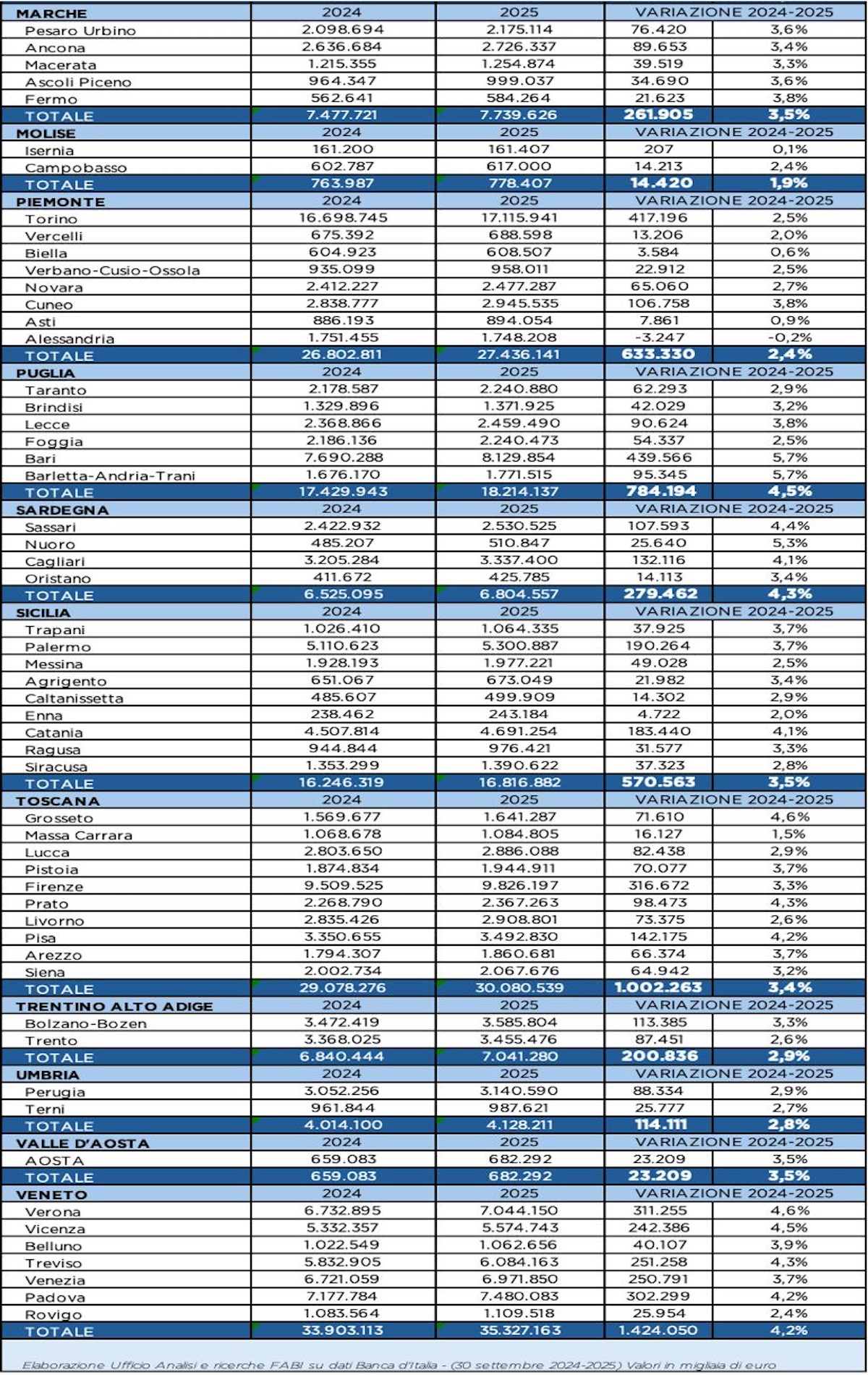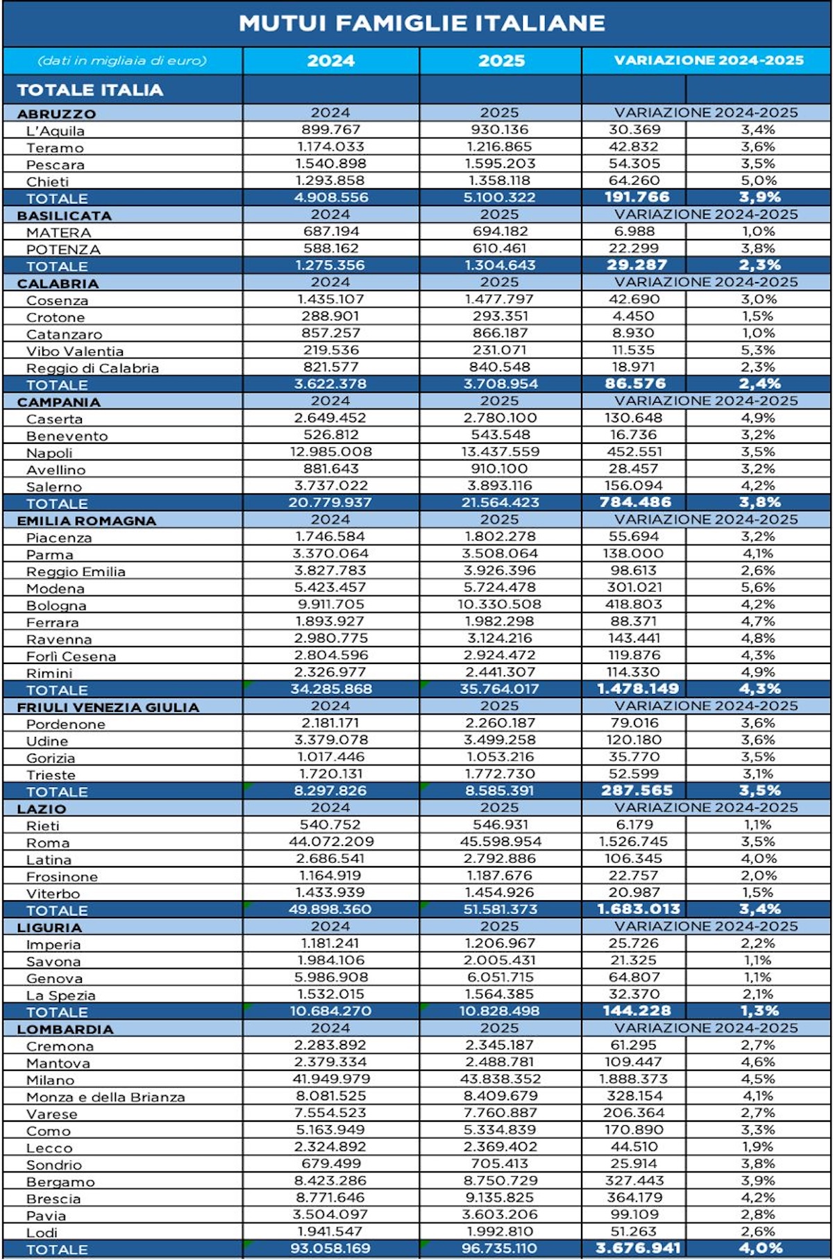 Se la classifica per valore assoluto dei mutui nel 2025 conferma il primato strutturale del Nord – con Lombardia e Lazio che da sole concentrano oltre 148 miliardi di euro – è nelle variazioni percentuali che emerge il segnale di ripresa del Mezzogiorno, con la Puglia che si colloca al primo posto nazionale per crescita percentuale (+4,5%), superando tutte le grandi regioni settentrionali. Un dato che pesa, perché arriva da una regione che nel 2025 muove comunque 18,2 miliardi di euro di mutui. La Puglia non cresce solo “in proporzione”, ma consolida una massa di credito già significativa, affiancandosi alle regioni leader per dinamica, pur restando distante dai volumi assoluti di Lombardia (96,7 miliardi) e Lazio (51,6 miliardi). Il confronto tra le due classifiche restituisce così un’Italia a due letture complementari: da un lato il Nord che continua a detenere la maggior parte degli investimenti immobiliari, dall’altro un Sud che torna a correre più veloce. E in questo rimbalzo, la Puglia diventa il simbolo di un mercato che, dopo anni di prudenza, mostra segnali concreti di riattivazione della domanda e di maggiore fiducia delle famiglie. Nel passaggio tra settembre 2024 – settembre 2025 (valori in migliaia di euro rielaborati qui in miliardi e milioni), i mutui delle famiglie per l’acquisto dell’abitazione disegnano una dinamica chiara: non è una crescita “uniforme”, ma una spinta che si concentra dove il mercato è più liquido e dove alcune province fanno da locomotiva, lasciando in evidenza territori che avanzano di poco o addirittura arretrano. Abruzzo. Il totale regionale sale da 4,91 miliardi a 5,10 miliardi, pari a +191,77 milioni e +3,9%: un passo solido, con una notizia netta nel dettaglio provinciale, perché Chieti è il vero acceleratore con un salto da 1,29 miliardi a 1,36 miliardi (+64,26 milioni, +5,0%). Il resto del territorio cresce con regolarità: Pescara passa da 1,54 miliardi a 1,60 miliardi (+54,31 milioni, +3,5%), Teramo da 1,17 miliardi a 1,22 miliardi (+42,83 milioni, +3,6%), L’Aquila da 0,90 miliardi a 0,93 miliardi (+30,37 milioni, +3,4%). Abruzzo quindi in progresso, ma con un picco più marcato nel chietino. Basilicata. La regione cresce da 1,28 miliardi a 1,30 miliardi, cioè +29,29 milioni e +2,3%: qui la “notizia” è che la spinta arriva quasi tutta da Potenza, che sale da 0,59 miliardi a 0,61 miliardi (+22,30 milioni, +3,8%), mentre Matera resta sostanzialmente in tenuta, da 0,69 miliardi a 0,69 miliardi (+6,99 milioni, +1,0%). È un avanzamento più “bancario” che di mercato: poco slancio diffuso, molta concentrazione. Calabria. Totale in aumento da 3,62 miliardi a 3,71 miliardi, pari a +86,58 milioni e +2,4%: crescita moderata, ma con un segnale forte su Vibo Valentia, che si distingue passando da 0,22 miliardi a 0,23 miliardi (+11,54 milioni, +5,3%), cioè la variazione percentuale più alta della regione. Il profilo complessivo resta però “di tenuta”: Cosenza sale da 1,44 miliardi a 1,48 miliardi (+42,69 milioni, +3,0%), Reggio di Calabria da 0,82 miliardi a 0,84 miliardi (+18,97 milioni, +2,3%), Catanzaro da 0,86 miliardi a 0,87 miliardi (+8,93 milioni, +1,0%), Crotone da 0,29 miliardi a 0,29 miliardi (+4,45 milioni, +1,5%). Calabria quindi: pochi “scatti”, una crescita generale più prudente. Campania. La regione sale da 20,78 miliardi a 21,56 miliardi, con +784,49 milioni e +3,8%: qui la notizia è doppia, perché la massa critica resta in Napoli, che cresce da 12,99 miliardi a 13,44 miliardi (+452,55 milioni, +3,5%), ma l’allungo più incisivo in termini percentuali arriva da Caserta, da 2,65 miliardi a 2,78 miliardi (+130,65 milioni, +4,9%). Completano il quadro Salerno, che aumenta da 3,74 miliardi a 3,89 miliardi (+156,09 milioni, +4,2%), Avellino da 0,88 miliardi a 0,91 miliardi (+28,46 milioni, +3,2%) e Benevento da 0,53 miliardi a 0,54 miliardi (+16,74 milioni, +3,2%). Campania in crescita robusta: Napoli domina per volumi, Caserta e Salerno danno spessore all’espansione. Emilia-Romagna. Totale da 34,29 miliardi a 35,76 miliardi, cioè +1,48 miliardi e +4,3%: è una delle crescite più consistenti, e la notizia sta nel baricentro provinciale. Bologna sale da 9,91 miliardi a 10,33 miliardi (+418,80 milioni, +4,2%), ma è Modena a segnare l’accelerazione più tagliente, da 5,42 miliardi a 5,72 miliardi (+301,02 milioni, +5,6%). Dietro, un’espansione ampia e ben distribuita: Parma da 3,37 miliardi a 3,51 miliardi (+138,00 milioni, +4,1%), Ravenna da 2,98 miliardi a 3,12 miliardi (+143,44 milioni, +4,8%), Forlì-Cesena da 2,80 miliardi a 2,92 miliardi (+119,88 milioni, +4,3%), Rimini da 2,33 miliardi a 2,44 miliardi (+114,33 milioni, +4,9%), Ferrara da 1,89 miliardi a 1,98 miliardi (+88,37 milioni, +4,7%), Reggio Emilia da 3,83 miliardi a 3,93 miliardi (+98,61 milioni, +2,6%), Piacenza da 1,75 miliardi a 1,80 miliardi (+55,69 milioni, +3,2%). Emilia-Romagna: crescita “industriale” anche nei mutui, con locomotiva Modena e peso massimo Bologna. Friuli-Venezia Giulia. Il totale aumenta da 8,30 miliardi a 8,59 miliardi, pari a +287,57 milioni e +3,5%: dinamica compatta, senza strappi, con due province che segnano la linea. Udine sale da 3,38 miliardi a 3,50 miliardi (+120,18 milioni, +3,6%) e Pordenone da 2,18 miliardi a 2,26 miliardi (+79,02 milioni, +3,6%). Gorizia passa da 1,02 miliardi a 1,05 miliardi (+35,77 milioni, +3,5%), Trieste da 1,72 miliardi a 1,77 miliardi (+52,60 milioni, +3,1%). Notizia: crescita equilibrata, con Udine che resta perno. Lazio. Totale in salita da 49,90 miliardi a 51,58 miliardi, cioè +1,68 miliardi e +3,4%: qui la notizia è che la regione cresce perché Roma si muove, e quando Roma si muove cambia la scala. La Capitale passa da 44,07 miliardi a 45,60 miliardi (+1,53 miliardi, +3,5%). Fuori Roma, avanzano soprattutto Latina, da 2,69 miliardi a 2,79 miliardi (+106,35 milioni, +4,0%), mentre la crescita è più contenuta in Frosinone da 1,16 miliardi a 1,1